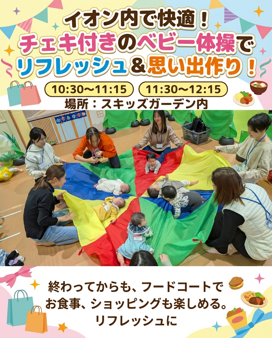 イオン内で快適に過ごしながら、親子でふれあい時間を楽しめる「ベビー体操・思い出作りワークショップ」を開催します👶💞